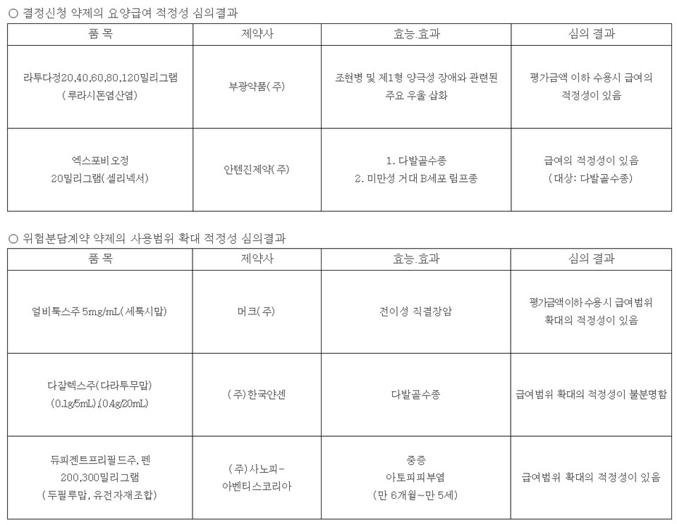다만 약평위는 이번 다잘렉스 급여 확대 건에 대해 예전과 같이 '비급여', '급여 적정성 없음', '재논의'가 아닌