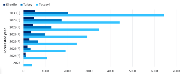 이에 따르면 RRMM은 환자가 증가하는 가운데 치료제로 승인된 텍베일리, 탈베이(Talvey, talquetamab), 얼렉스피오(Elrexfio, elranatamab)가 뛰어난 반응률로 2030년까지 총 90억달러의 매출을 올릴 것으로 전망된다.